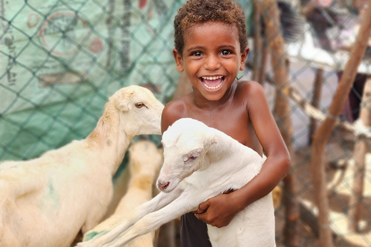 Doch jetzt bestätigt sich der unerschütterliche Optimismus der Frau: im Rahmen eines von uns unterstützten Hilfsprojektes hat sie nicht nur Lebensmittelvorräte erhalten, die die Grundversorgung ihrer Familie auf Wochen sicherstellt, sondern sie kann auch an einem Viehzuchtprojekt teilnehmen. Gemeinsam mit 19 anderen ausgewählten Teilnehmerinnen besuchte sie zunächst eine Schulung, die sie mit dem Halten und der Zucht von Schafen vertraut machte. Und dann war der große Moment da: Nach dem Bau eines kleinen, stabilen Geheges hielten zwei Mutterschafe und ein Schafbock Einzug. Die Kinder sind begeistert von den hübschen Tieren, während für Hussina natürlich in erster Linie zählt, dass sich ihre wirtschaftliche Lage verbessert. Die Tiere sind genügsam und brauchen nur etwas Weidefläche und darüber hinaus Kraftfutter, das anfänglich gestellt wird. Sie liefern Milch zur Verarbeitung zu Käse und Joghurt sowie Wolle zur Herstellung von wärmenden Decken. Vor allem aber ist absehbar, dass sich die kleine Herde bald vergrößern wird. Dadurch bekommt Hussina Omar die Chance auf weitere Einkommensmöglichkeiten, beispielsweise durch den Verkauf einiger Tiere.