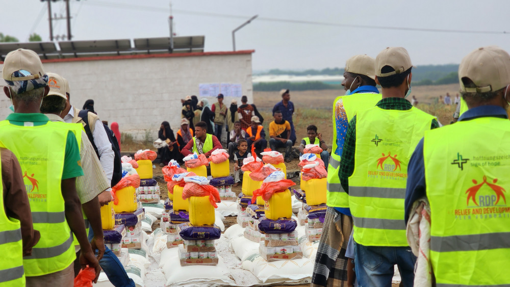 Majed Hassan ist erschöpft nach einem langen Arbeitstag. Als Träger schleppt er jeden Tag schwere Kisten und Säcke auf Märkte. Doch immerhin, es ist eine regelmäßige Arbeit, und damit steht der Vater von vier Kindern besser da als viele andere im Flüchtlingslager Al-Salam im Gouvernement Al-Hudaida. Sein harter körperlicher Einsatz bringt ihm ein kleines Gehalt ein – das langt freilich nicht, um seine sechsköpfige Familie ausreichend zu versorgen. Die Lebensmittelpreise im Land sind hoch. „Unsere Teller sind meistens leer“, berichtet er den Mitarbeitenden unserer Partnerorganisation Relief and Development Peer Foundation (RDP). Majed Hassan und seine Familie hungern oft, und wie ihnen geht es etwa zwei Drittel der Bevölkerung. „Durch den aktuellen Konflikt sind fast 22 der rund 33 Mio. Einwohnerinnen und Einwohner auf humanitäre Hilfe angewiesen, darunter knapp 13 Mio. Kinder“, berichtet das Bundesministerium für wirtschaftliche Zusammenarbeit und Entwicklung. „Etwa 17 Mio. Menschen haben nicht ausreichend zu essen, mehr als 4,5 Mio. Menschen wurden aus ihren Heimatorten vertrieben und mussten in anderen Landesteilen Schutz suchen.“