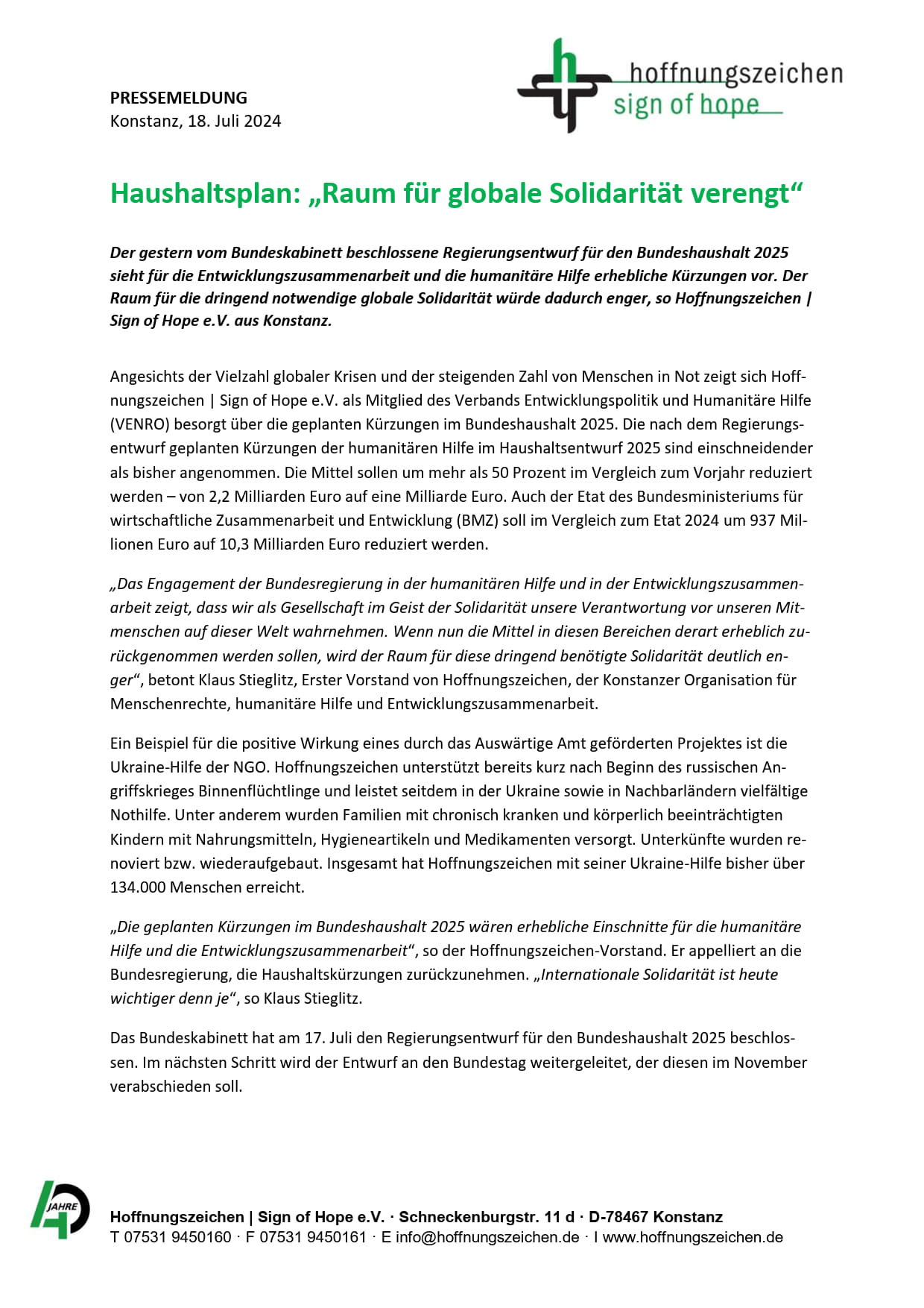 „Das Engagement der Bundesregierung in der humanitären Hilfe und in der Entwicklungszusammenarbeit zeigt, dass wir als Gesellschaft im Geist der Solidarität unsere Verantwortung vor unseren Mitmenschen auf dieser Welt wahrnehmen. Wenn nun die Mittel in diesen Bereichen derart erheblich zurückgenommen werden sollen, wird der Raum für diese dringend benötigte Solidarität deutlich enger“, betont Klaus Stieglitz, Erster Vorstand von Hoffnungszeichen, der Konstanzer Organisation für Menschenrechte, humanitäre Hilfe und Entwicklungszusammenarbeit.