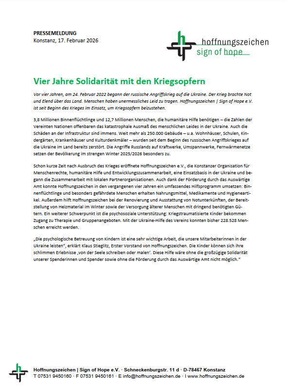 Schon kurze Zeit nach Ausbruch des Krieges eröffnete Hoffnungszeichen e.V., die Konstanzer Organisation für Menschenrechte, humanitäre Hilfe und Entwicklungszusammenarbeit, eine Einsatzbasis in der Ukraine und begann die Zusammenarbeit mit lokalen Partnerorganisationen. Auch dank der Förderung durch das Auswärtige Amt konnte Hoffnungszeichen in den vergangenen vier Jahren ein umfassendes Hilfsprogramm umsetzen: Binnenflüchtlinge und besonders gefährdete Menschen erhalten Nahrungsmittel, Medikamente und Hygieneartikel. Außerdem hilft Hoffnungszeichen bei der Renovierung und Ausstattung von Notunterkünften, der Bereitstellung von Heizmaterial im Winter sowie der Versorgung älterer Menschen mit dringend benötigten Gütern. Ein weiterer Schwerpunkt ist die psychosoziale Unterstützung: Kriegstraumatisierte Kinder bekommen Zugang zu Therapie und Gruppenangeboten. Mit der Ukraine-Hilfe des Vereins konnten bisher 228.528 Menschen erreicht werden.